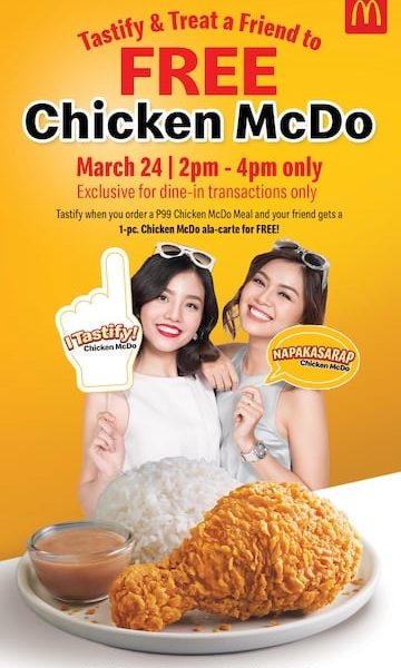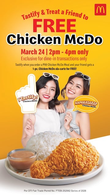 Happening this March 24, 2026, from 2:00 PM to 4:00 PM in all its branches nationwide, the treat is McDonald’s way of letting more people tastify to the napakasarap, napakacrispy and napakajuicy Chicken McDo. Each customer who buys a 1-pc Chicken McDo meal with a drink for P99 can get a 1-pc Chicken McDo a la carte for their friend for FREE!